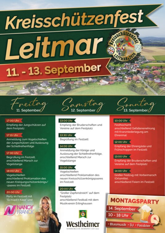Drei Tage Party sind nicht genug!!! Daher hängen wir noch einen Tag dran und machen am 14. September 2026 noch die Montagsparty, auf der wir das Kreisschützenfest angemessen verabschieden wollen. Alle, die auch am vierten Tag noch Durst und Lust auf eine Party in lockerer Zeltatmosphäre haben, sind herzlich eingeladen bei Blasmusik, DJ und einem kühlen Getränk das Kreisschützenfest noch einmal Revue passieren zu lassen! Beginn ist um 10:00 Uhr im Festzelt auf dem Festgelände.